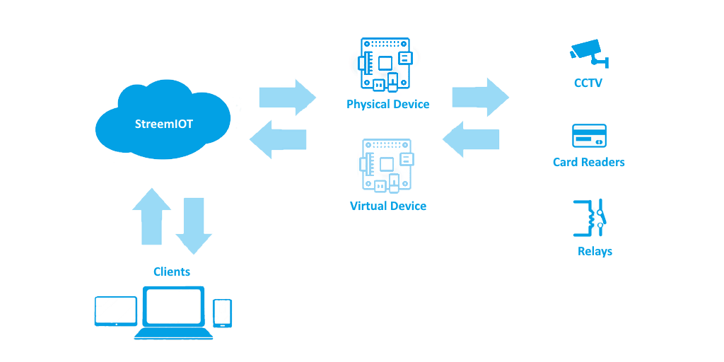 StreemIOT is a platform to allow a client (e.g. from a laptop or mobile) to access and control remote IOT devices. Data control can be both light (e.g. remote relay control) or heavy (e.g. video stream). Custom StreemIOT software can be installed onto generic devices (e.g. the Raspberry PI) to provide an on-premise physical node in order to interface with other systems and devices within a LAN environment. Alternatively a StreemIOT 'Virtual Device' can be created on standard Linux/Windows server in situations where the use of physical hardware is not necessary.